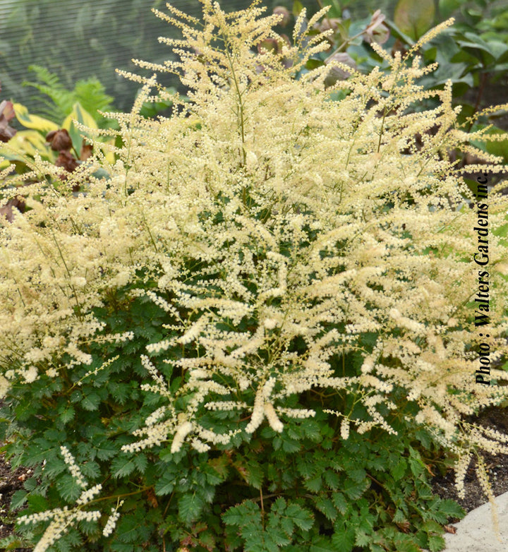 Panicule de fleurs aériennes, de couleur crème, qui apporte de la lumière dans les endroits sombres. Floraison qui ressemble à celle d'une Astilbe mais, plus résistante que celle-ci à la sécheresse. Plant plus large que haut.