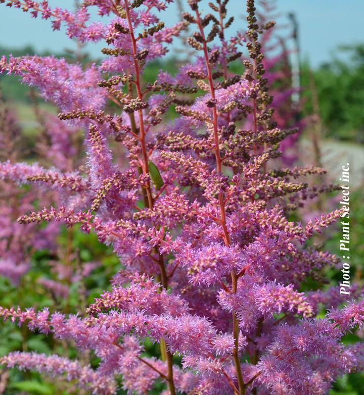 Floraison bien au-dessus du feuillage, d’un lilas pourpre qui se démarque des autres coloris d’astilbes. Grandes hampes florales. Variété élégante. Peut pousser au plein soleil, si le sol est bien irrigué.
