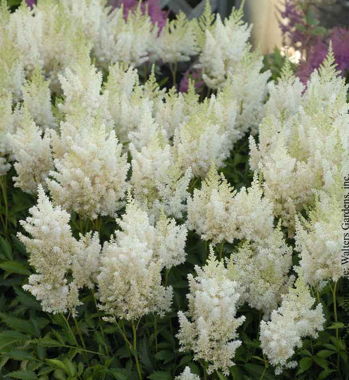 Larges plumeaux bien remplis de fleurs blanc crème. Floraison dense et compacte. Beau feuillage luisant et foncé. Syn. : Astilbe ‘Weisse Gloria’