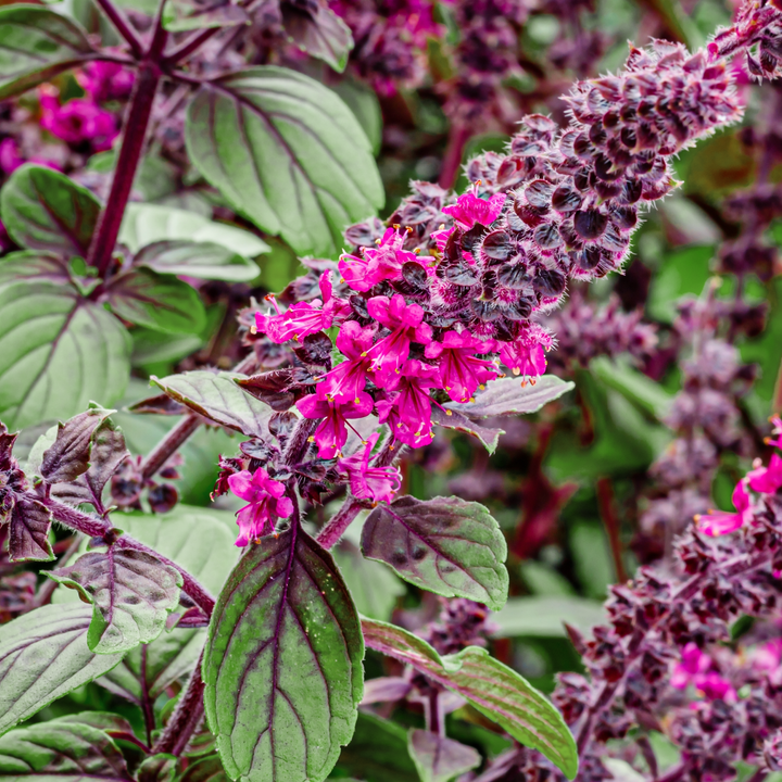 Hybride vivace sous nos latitudes chaudes ou cultivé en annuelle, le Basilic ‘African Blue’ séduit par son feuillage vert veiné de pourpre, très aromatique, et ses longues hampes florales violettes qui attirent les pollinisateurs tout l’été. À la fois ornemental et comestible, il est parfait en bordure, pot ou jardin gourmand.