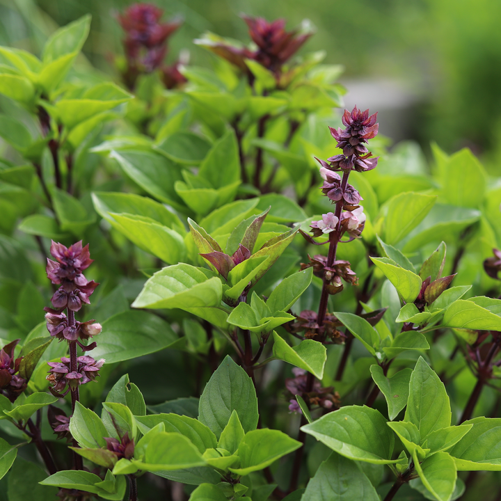 Le basilic thaï 'Siam Queen' se démarque par ses feuilles étroites, ses tiges pourpres et son parfum intense de réglisse et d’anis. Très utilisé dans la cuisine asiatique, notamment thaïlandaise et vietnamienne, il supporte bien la cuisson et offre une saveur riche et épicée.