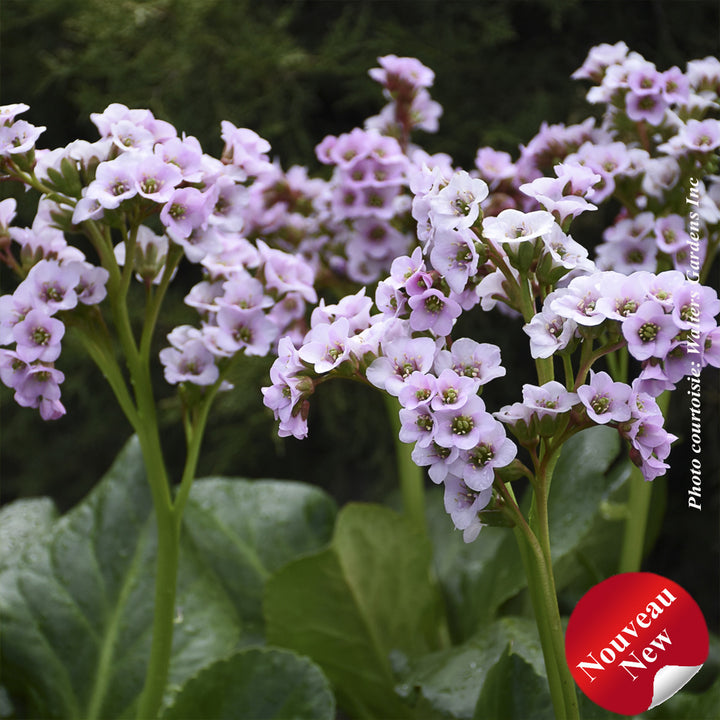 Les pétales blancs et roses sont bordés d'une fine marge rose plus foncé. Près des fleurs, les tiges sont d'un rose vif avant de passer au vert près de la base. Les feuilles ondulées et dentelées sont très épaisses. Les bergenias sont des plantes vivaces fiables à feuilles persistantes.