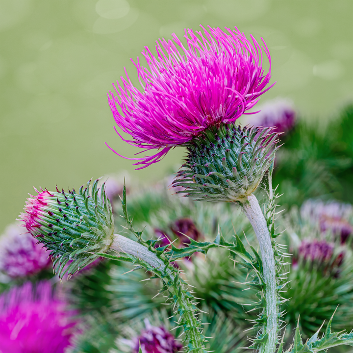 Spectaculaire pour son feuillage marbré d’argent et ses grandes fleurs pourpres, le Chardon marie est célèbre pour ses propriétés hépatoprotectrices. Il apporte à la fois structure et beauté dans les jardins. Les graines du chardon marie sont riches en nutriments, il est aussi une source de nourriture précieuse pour les chardonnerets. En plus de ses bienfaits médicinaux pour le foie chez les humains.