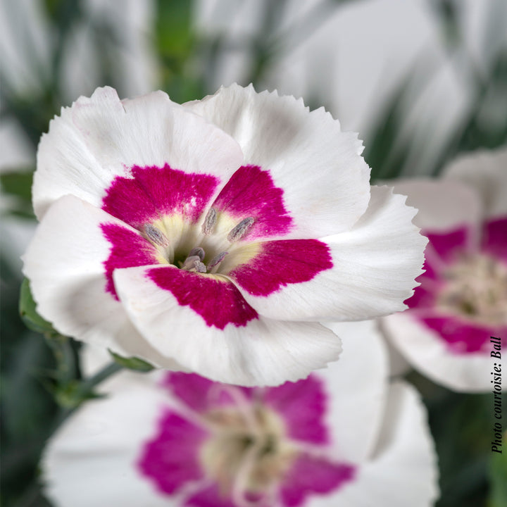 Un Dianthus qui nous présente de superbes et grandes fleurs délicieusement parfumées, blanc pur à large centre magenta, qui contrastent avec le feuillage gris bleu. Les fleurs sont portées sur de longues et fortes tiges. Plant compact et dressé.
