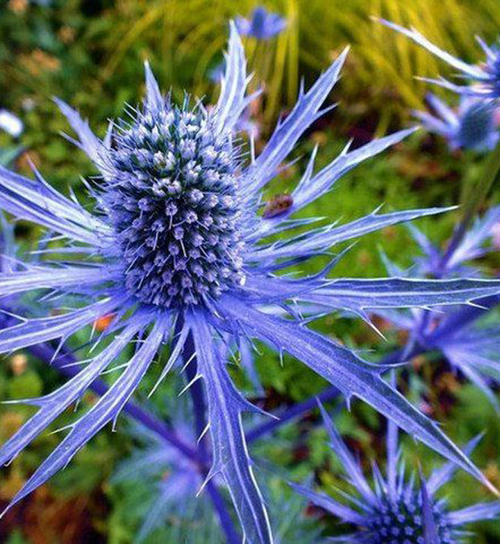Variété aux fleurs mauves délicates, accompagné d’un feuillage bleu métallique brillant. Cette plante se distingue par sa remarquable tolérance à la chaleur, aux sols secs et aux embruns salins. Associée à d'autres plantes aux couleurs chaudes, elle crée un magnifique contraste visuel, ajoutant du dynamisme et de l’élégance au jardin.