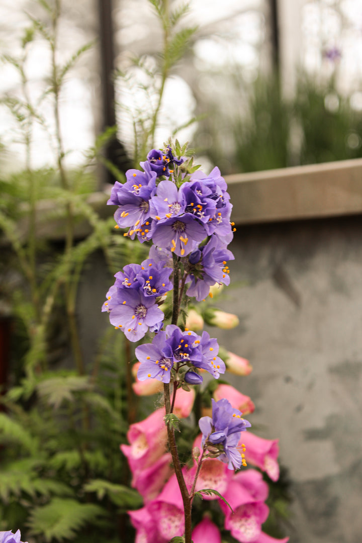 Beau feuillage pourpre qui verdit en été et reprend des teintes violacées quand la température est fraîche. Les fleurs bleu cobalt sont réunies en grappes terminales au-dessus du feuillage. C'est un bon choix pour accompagner les hostas et les heuchères. Pousse bien dans l'ombre dense si le sol est frais.