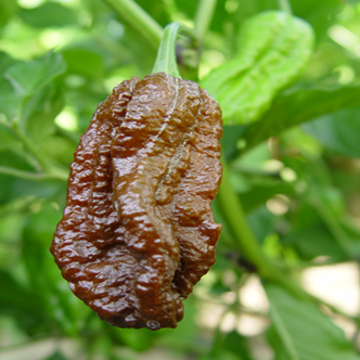 Le piment Bhut Jolokia brun, aussi connu sous le nom de 'Ghost Pepper', est une variété légendaire pour les amateurs de sensations fortes. Originaire d'Inde, ce piment a autrefois détenu le record mondial de l'échelle de Scoville pour son extrême piquant. Sa teinte brune intense lui confère une apparence impressionnante, qui se démarque visuellement dans le jardin. Malgré sa chaleur brûlante, il dévoile des notes subtiles de fruits et de fumée, apportant une profondeur unique aux sauces, marinades ou plats nécessitant un coup de chaleur puissant.