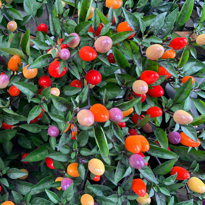 Le piment 'Bolivian Rainbow' est une variété ornementale et comestible originaire de Bolivie, appréciée pour ses fruits aux couleurs changeantes et son apparence éclatante. Les piments passent du violet au jaune crème, puis à l'orange et au rouge à maturité, offrant un spectacle visuel tout au long de leur développement. Avec un piquant modéré d’environ 30 000 unités sur l’échelle de Scoville, ces petits fruits sont parfaits pour la décoration comme pour relever vos plats.