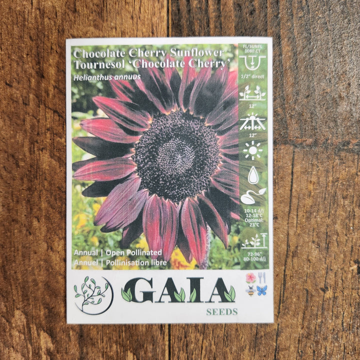 Le Tournesol 'Chocolate Cherry' (Helianthus annuus) du semencier Gaia est une variété spectaculaire, reconnue pour ses pétales rouge bordeaux profond et son cœur presque noir.